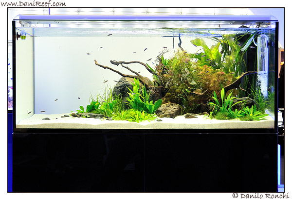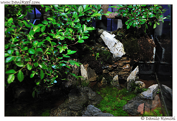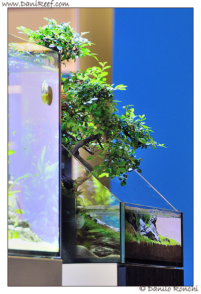 Pictured in the foreground into a SystemMini tank we see the new products that we discuss later, then two SystemMini traditional, one fresh water and one Marine, and then the new spectacular Paludarium with bonsai.