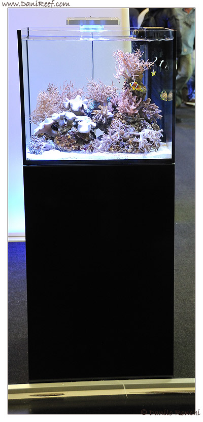 Coming from 4A Hall, you can see the Elos stand with in the foreground the new beautiful Elos Midi. The presentation in 2008 of the new concept of Mini Reef all in one, the SystemMini, had opened a road and left a vacuum to be filled, an aquarium largest than SystemMini yet smaller and less demanding than System70.