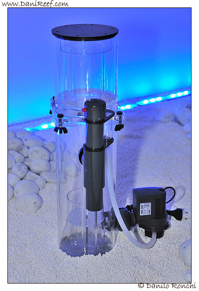 Here the base of the skimmer, it’s raised from the bottom with four rubber feet, you notice the bubbles inside the body, the contact chamber and the water output pipe.