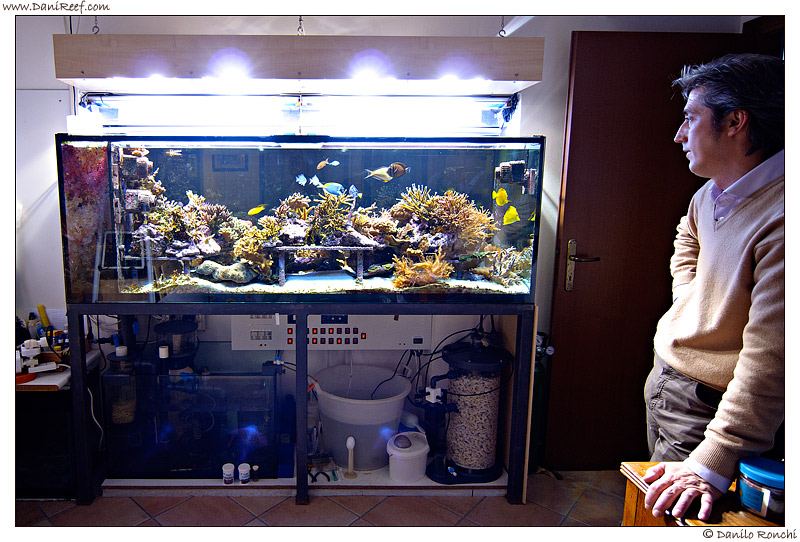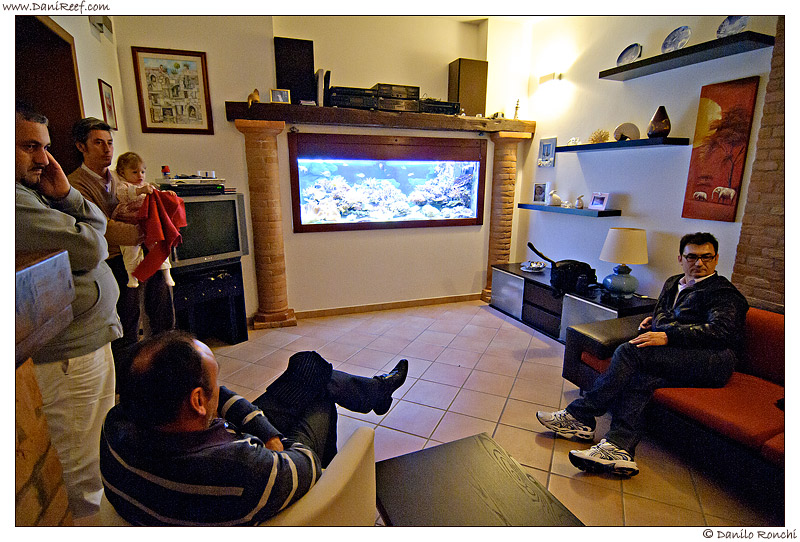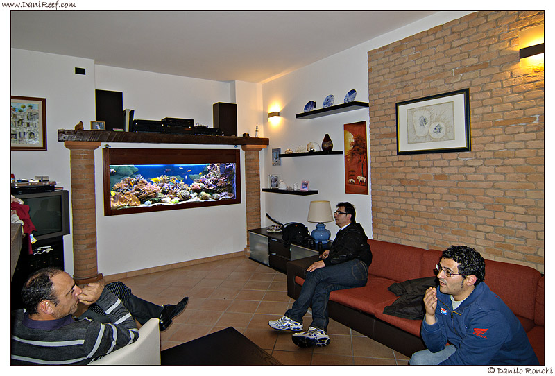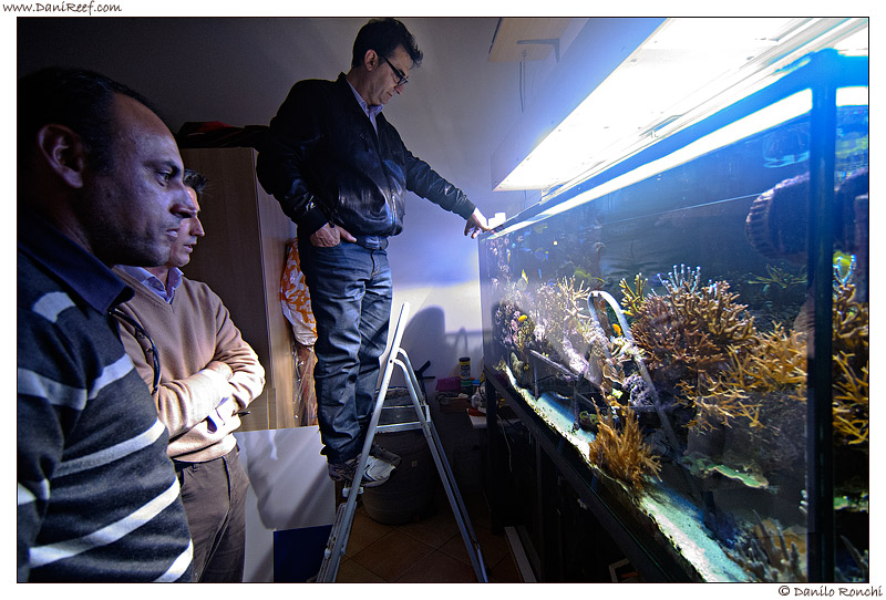 In this picture we are also facing the tank from above, in the back room of the sump. Lumaz in the foreground, Giuseppe on the stairs, listening carefully Cristiano recounting the genesis of his tank.