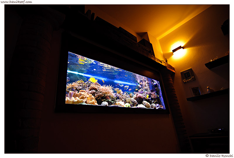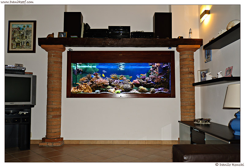 Ciao a tutti, L’acquario a muro, a mio avviso ,esteticamente è il più bel contesto che si può realizzare in una stanza domestica, eliminando qualsiasi rumore ed occultanto tutte le attrezzature. Incassare una vasca in un muro portante, da 30 cm ed oltre diventa complicato, semplicemente perchè per tale profondità ci giochiamo il posizionamento dell’illuminazione che obbligatoriamente verrà sfalsata dal centro della vasca,il mio acquario praticamente alloggia nella stanza adiacente alla sala, e il vetro frontale resta a filo del muro , il consiglio e di mettere a muro una vasca ma solo dove vi è un muro da 15 cm in modo che così la luce viene posizionata nel migliore dei modi,ad esempio la mia vasca misura 200x70x70 cm, e la nicchia nel muro è di 210×85 cm,lo spazio che vi è tra muro e vasca viene chiuso con una cornice in legno, e le manutenzioni vengono effettuate nella stanza confinante, dove è ubicata la vasca.