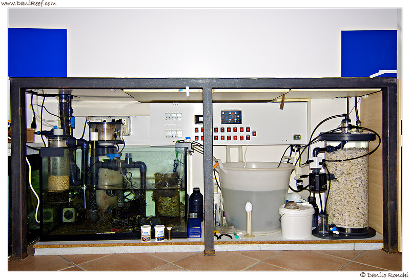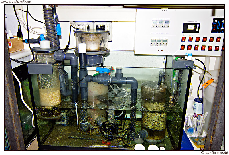 La sump ha dimensioni di 80x50x50 ed il livello dell’acqua è mantenuto stabile a circa 25 cm. Tutto è autocostruito, partendo dal filtro percolatore inserito all’interno del pozzetto di tracimazione, da qui l’acqua viene convogliata per caduta dentro la colonna di contatto dello schiumatoio, all’uscita di questo l’acqua segue un percorso forzato che passa in un filtro di zeolite e carbone attivo, ove ci sono 2 litri di zeolite ed 1 litro di carbone attivo. In sump trova posto anche un filtro a letto fluido caricato con 500gr di Biopellets. Cristiano non effettua integrazioni, ma si affida al grosso reattore di calcio autocostruito.