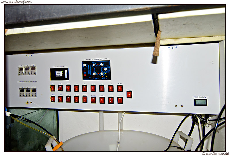 A parte tutte le considerazioni tecniche però quello che ci ha colpito maggiormente è il sapere che in fase di costruzione della vasca è stata predisposta una serpentina di acqua calda, quella dei termosifoni, proprio sotto la sump, in questo modo si riesce a riscaldare l’acquario con il calore dei termosifoni diminuendo notevolmente il peso della bolletta elettrica. Vorrei inoltre far notare l’enorme pannello elettrico, sempre autocostruito posto sopra la sump, bellissimo!