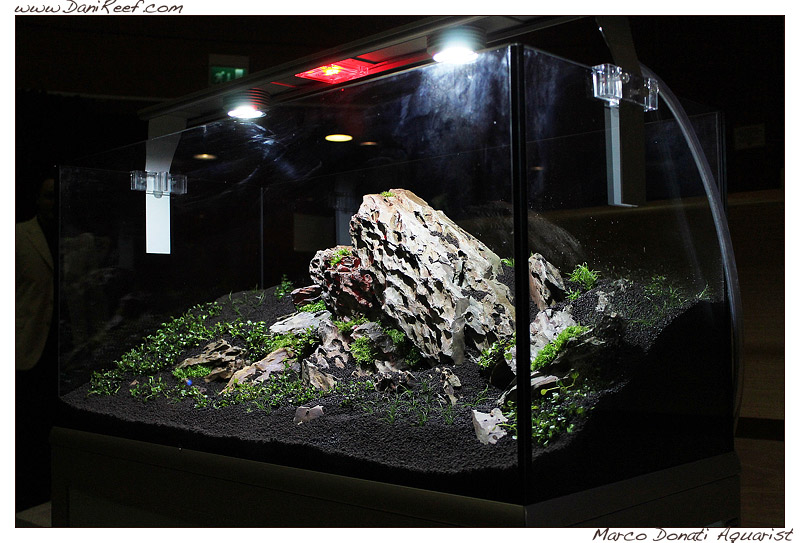 Vedendo l’artista all’opera non ero l’unico in sala a commentare il fatto che continuava a buttar giù terra su terra, oltre a non so quante coppette contenenti le piante fornite da Anubias, uno dei maggiori sponsor del corso, allora mi sono permesso di fare due conti al volo; le rocce Drago Stone sono firmate ADA e su internet si trovano all’incirca a 8€/kg (x 30kg utilizzati), il substrato di Oliver Knott costa circa 40/50€ x 10 litri (x 5/6 sacchi utilizzati) e le cup di Anubias vengono circa 6€ cad. (ne ha usate una decina); ciò significa che per ottenere una layout del genere occorrono quasi 600€, il risultato tra qualche settimana sarà di certo meraviglioso ma quello che mi frena è il fatto che questo tipo di acquario ha una durata limitata rispetto agli altri. Ebbene sì, mentre ad esempio un acquario marino matura e si stabilizza dopo circa un anno (e intanto sarà “cresciuto molto rispetto al giorno dell’avvio”), un acquario del genere dopo un anno o poco più è già destinato a “collassare”. Il fondo avrà perso le sue proprietà nutritive e le piante raggiunto il loro massimo sviluppo tenderanno a decomporsi costringendo l’acquariofilo a ricominciare da capo. Non lo vedo un gran bell’investimento a meno che non si parli di un’esposizione in negozio o in un concorso che durerà al massimo una settimana, nella quale necessariamente si dovrà mostrare la vasca al top.