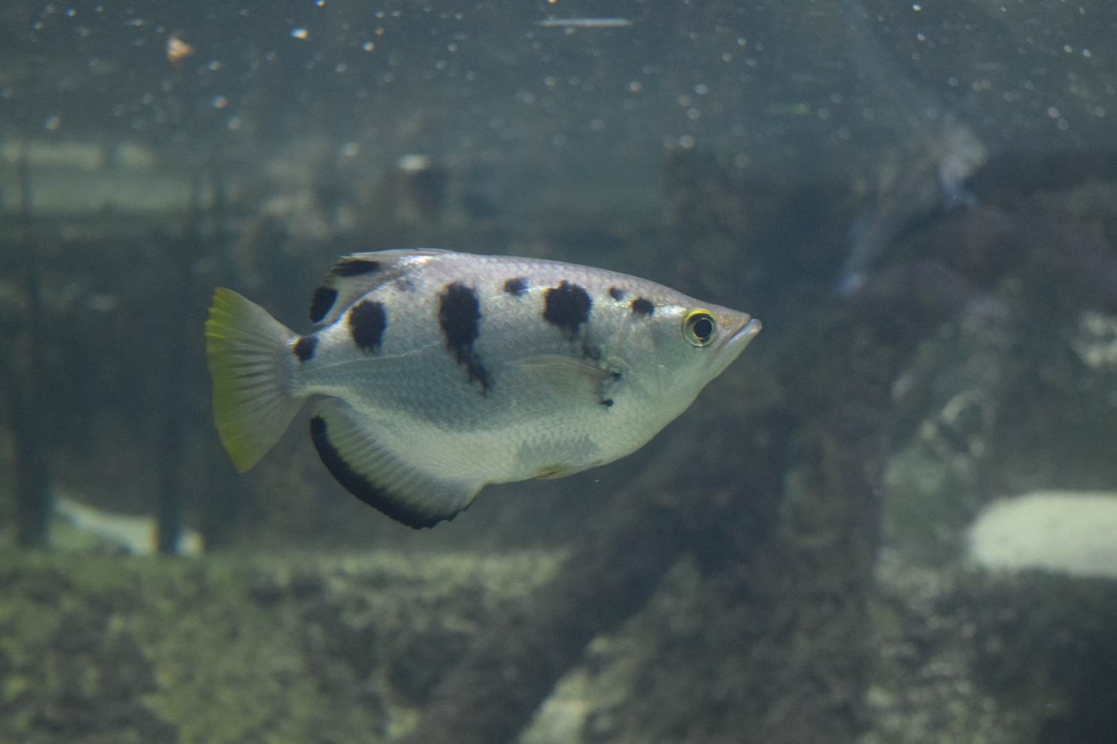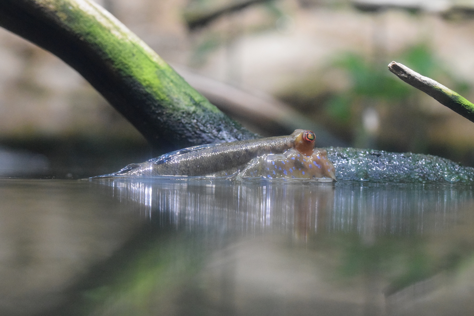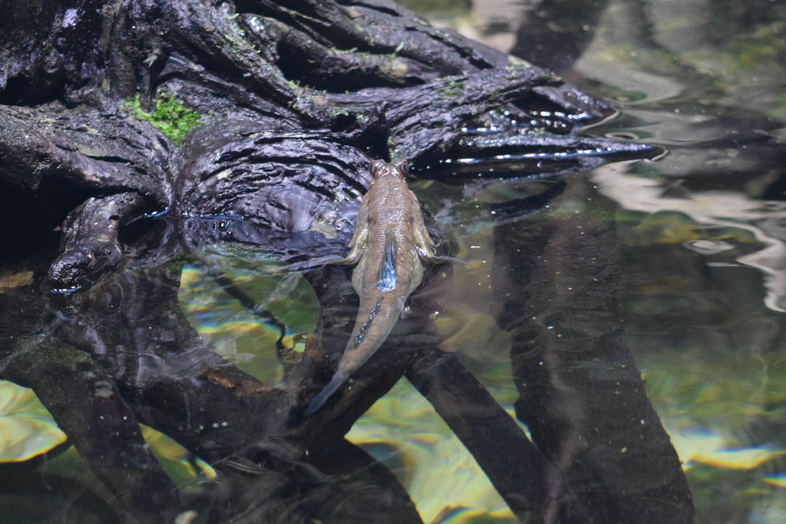 This ‘Mangrove in the Indo-Pacific‘ aquarium with brackish water simulates the tidal estuary found at an inlet, the outlet of a river, where the level of water isn’t constant and ebbs and flows along with the salinity. At Zoo Zurich these two aspects were also considered and, depending on the time you will arrive at the tank, the water level could be high or low. To enable visitors to observe the various stages of the tidal cycle, the time between the full tank and the ‘empty’ tank is four a half hours, instead of six, with four hours to fill/empty it, and a half hour break. Salinity is between 3% and 8%. This imperfection is on purpose, to better simulate the fluctuations found in nature. The tank contains 14’000 liters of water, when full, and 6’000 when the sea level is low. The automatic refill, made with osmosis water, isn’t precise and continuous (also because it would be very difficult to refill a tank which doesn’t have a constant water level) and this is the first factor that helps salinity to vary.