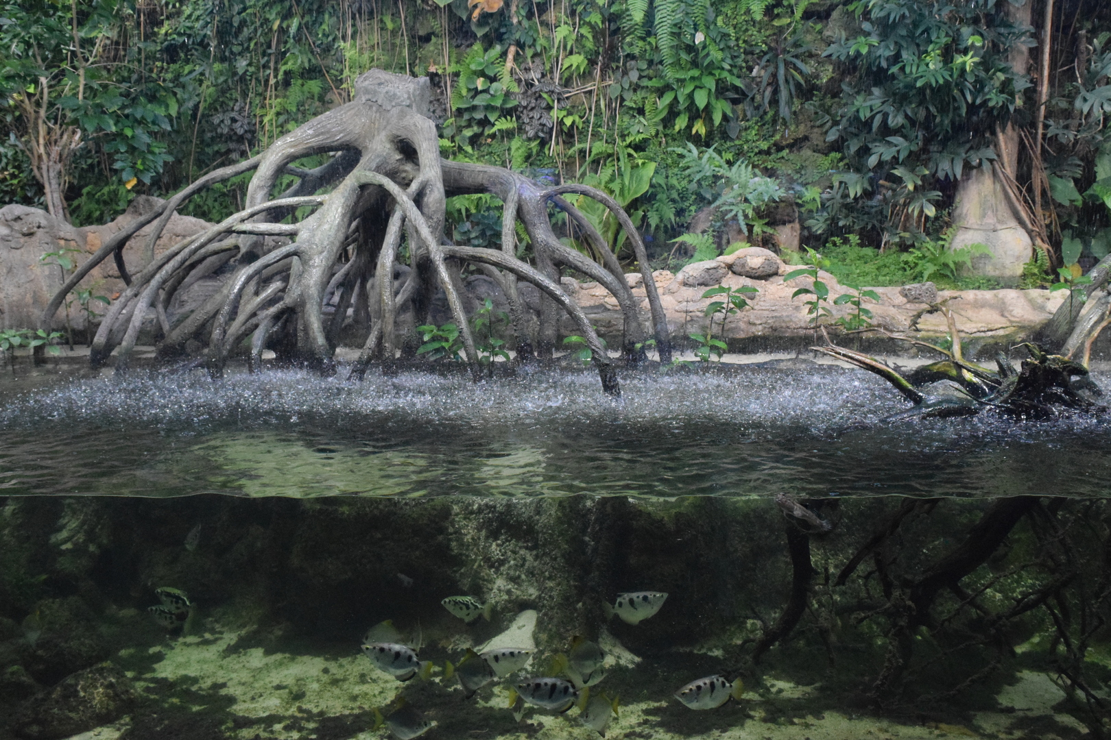 The mangroves of this aquarium are real, they are on the ground during the low tide and partially submerged by water during high tide. The plants growing on wall are also live and are not made of plastic. In this aquarium we can admire some fishes that are very particular.