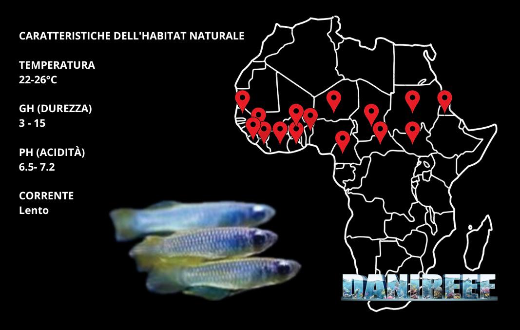 L’Aplocheilichthys normani, comunemente conosciuto come Pesce Occhio di Perla, proviene dall’Africa occidentale, in particolare da paesi come Senegal, Sudan, Nigeria, Benin, Burkina Faso, Camerun, Repubblica Centrafricana, Costa d’Avorio, Gana e Guinea. È un pesce piccolo e sorprendentemente affascinante, grazie al suo corpo grigio-argento, quasi trasparente, ed ai suoi occhi neri contornati da un bagliore blu iridescente.