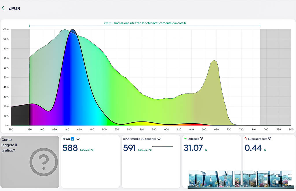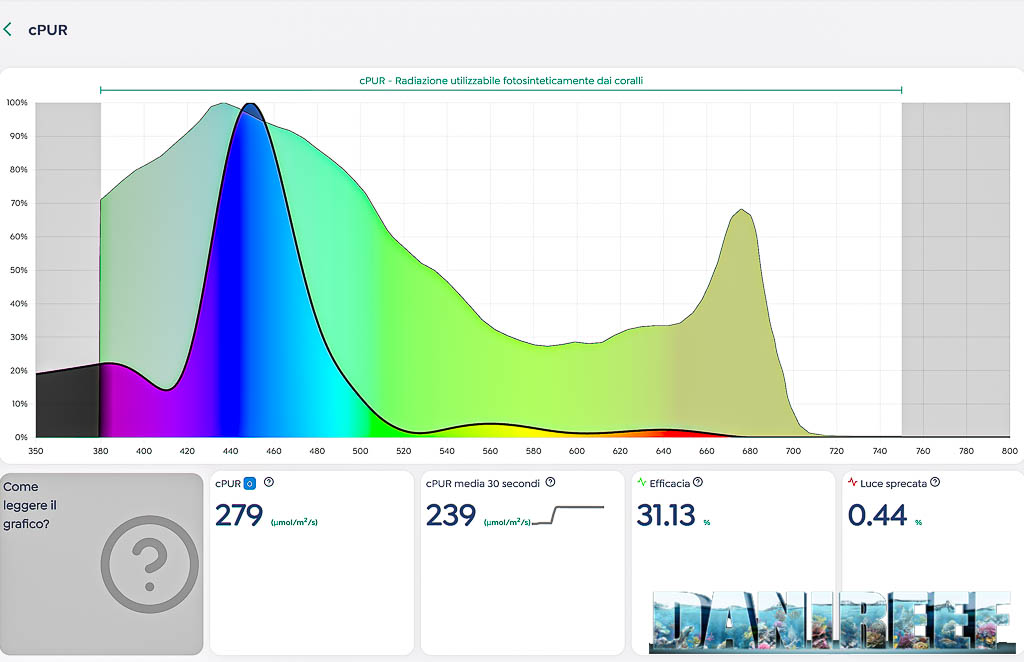 A seguire vediamo invece la curva in verde che indica il cPUR, ovvero la radiazione fotosintetica massima utilizzabile dei coralli. Il cPUR – “Coral Photosynthetically Usable Radiation” è una misurazione della luce specificamente progettata per i coralli. Secondo ITC, la grandezza dei PAR non ci dice se la luce che stiamo misurando sia effettivamente utile per la crescita dei coralli. Si potrebbe avere un livello di PAR elevato, ma concentrato completamente nella parte sbagliata dello spettro.