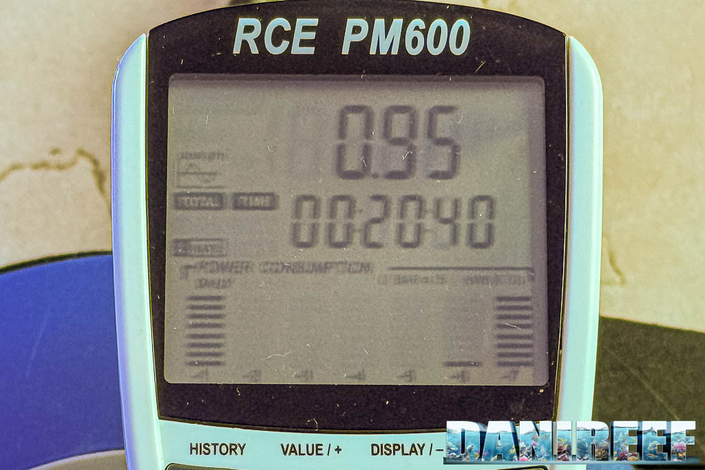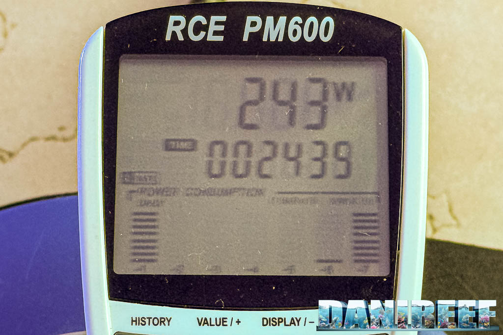 La plafoniera A8 Pro II Blue consuma quindi 243 watt, valore che si discosta poco da quanto dichiarato. Considerando che a 17 cm la plafoniera sviluppa al centro 2161 μmol m-2 s-1, si può dire, in prospettiva, che abbia un valore di picco di 8,89 μmol m-2 s-1 w-1 (PAR per watt), un valore di efficienza piuttosto basso, non tanto per i PAR che sono alti, ma quanto per il consumo che è elevatissimo. Per confronto la Radion ha circa gli stessi PAR consumando però 50 watt in meno. Quindi per avere gli stessi PAR la A8 PRO II Blue consuma il 33% in più. Addirittura rispetto alla Orphek Natura ha meno PAR, ma la Natura consuma 100 watt in meno. 150 watt la Natura, con PAR più alti della A8 PRO II Blue con 250 watt.