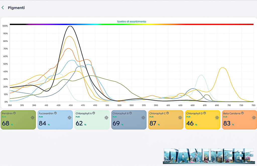 Il nuovo software del Parwise PRO ci permette anche di esplorare i vari pigmenti che vengono eccitati dalla luce. Attualmente prendiamo il dato per quello che è, quando avremo in mano altre plafoniere potremo fare delle comparazioni in merito.
