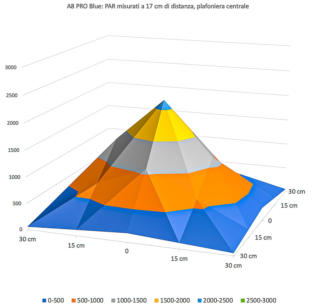 La prima misurazione ha la caratteristica di avere una limitata distanza fra plafoniera e sensore. I valori dei PAR espressi sono molto alti al centro ed hanno la caratteristica forma del tendone da circo. Questo è ovvio considerando la dimensione della plafoniera di 30×18 cm.
