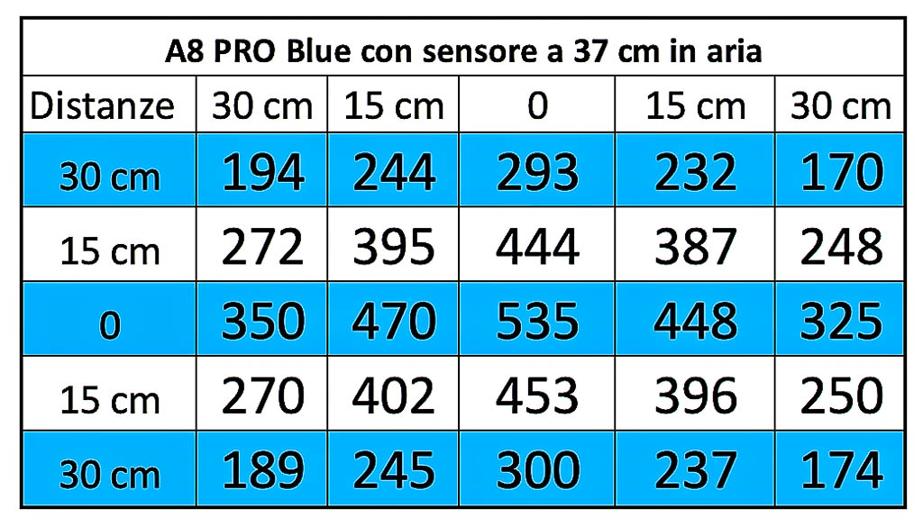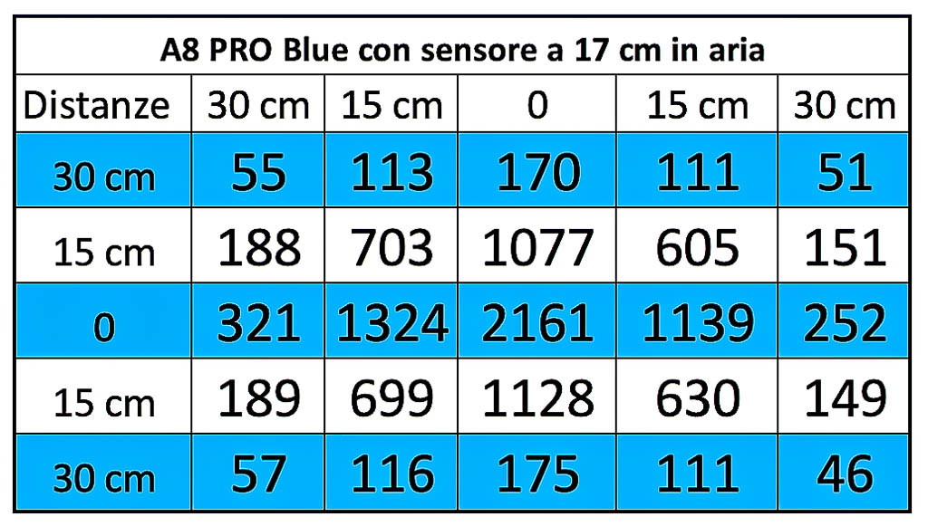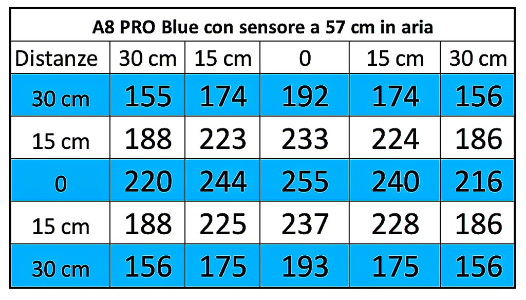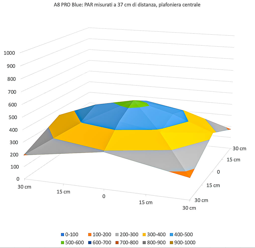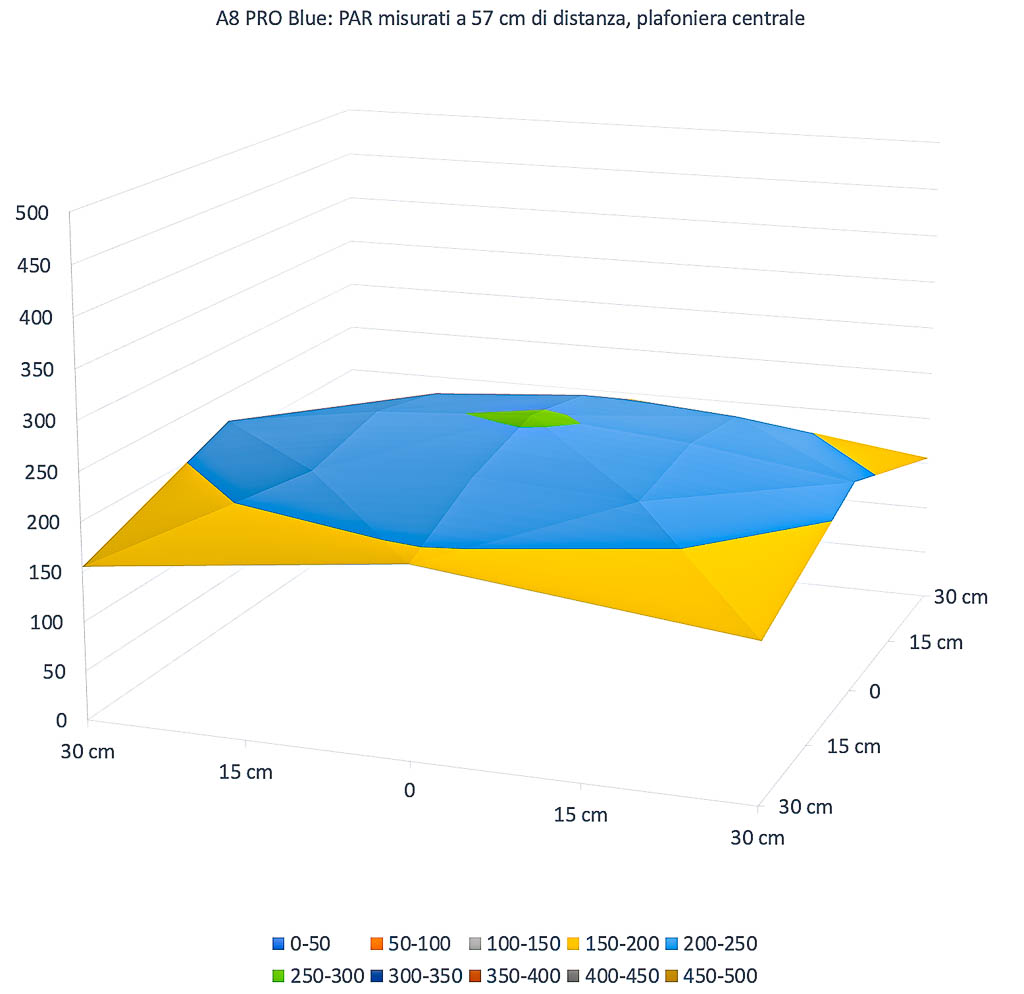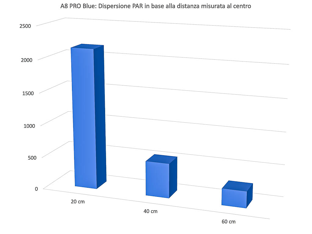Per la A8 PRO II Blue i valori sono molto costanti. Anche se si passa da una distribuzione fortemente centrata ad una quasi uguale su tutta la superficie. Ovviamente in base agli animali che si vogliono allevare è un valore ottimo per vasche larghe fino a 60 cm, buono per acquari che siano larghi 70 od 80 cm invece. Ovviamente considerando la larghezza bisogna considerare che sebbene la copertura sia buona, i raggi luminosi arriveranno fortemente inclinati ai lati per cui l’effetto sui coralli sarà comunque molto diverso rispetto ad una plafoniera più ampia, come ATI Straton, GNC BluRay X e Philips CoralCare.