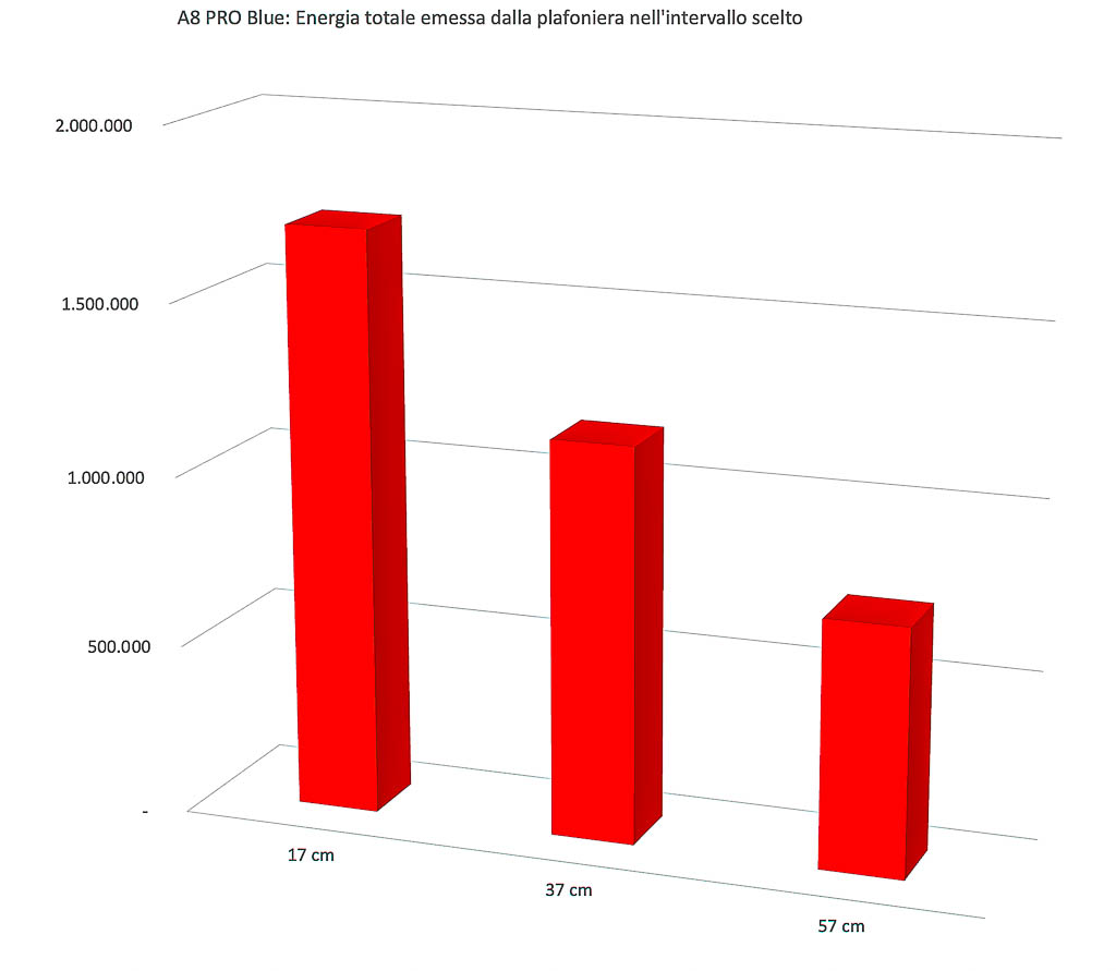 Questo secondo me è il dato più significativo fra quelli misurati, e quello più confrontabile. La variazione energetica. Sono stati calcolati i volumi sottesi dalle tre superfici che avete visto precedentemente. Perché è ovvio che allontanandosi dalla plafoniera i valori di PAR calino, ma calano anche perché la luce illumina uno spazio maggiore. In questo modo si cerca di tenere conto di tutta l’energia luminosa contenuta nell’ipotetico quadrato di 60 cm sotteso dalla plafoniera. E si vede che i tre valori 1.709.000, 1.158.000 e 725.000 assumono una diversa connotazione rispetto ai valori misurati al centro. Quando i primi sono calanti perché aumentano le distanze, l’area sottesa, ovvero l’energia, diminuisce meno, perché il “grosso” dell’illuminazione della plafoniera “concentrata” rimane al centro. Questa la teoria.