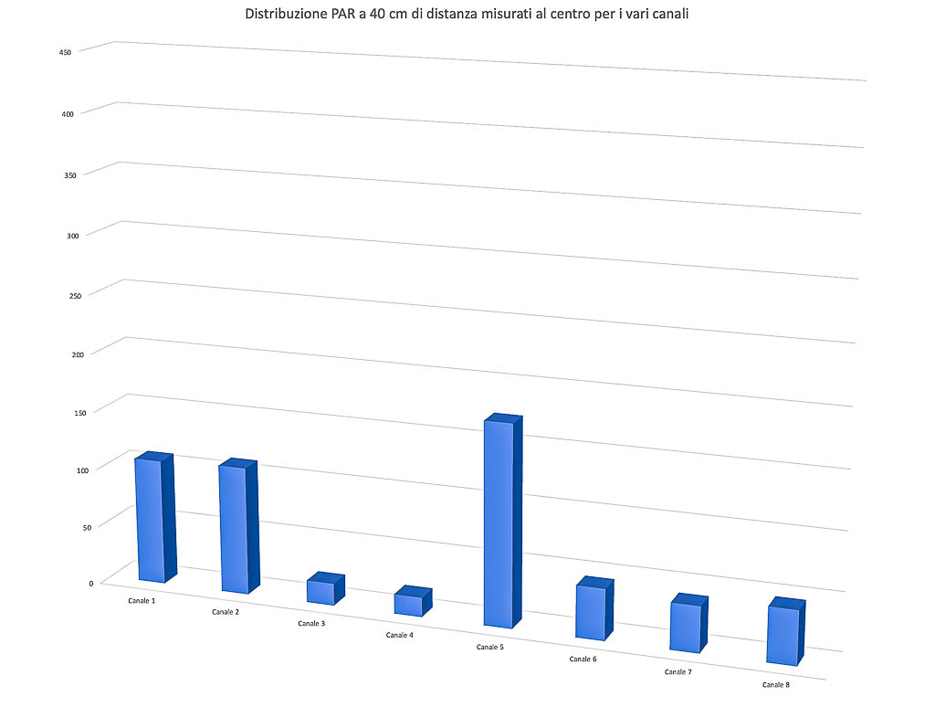 Abbiamo misurato anche i valori per ogni singolo canale, ma lo abbiamo fatto solo al centro, per darvi una idea di quale contributo i diversi canali abbiano sui PAR emessi.