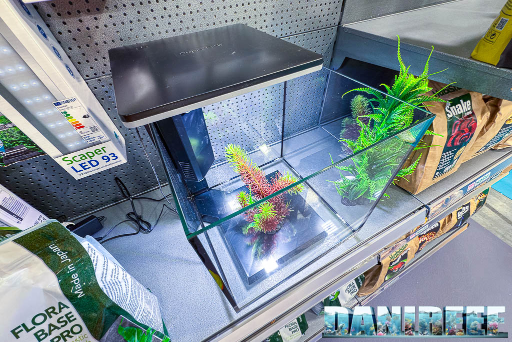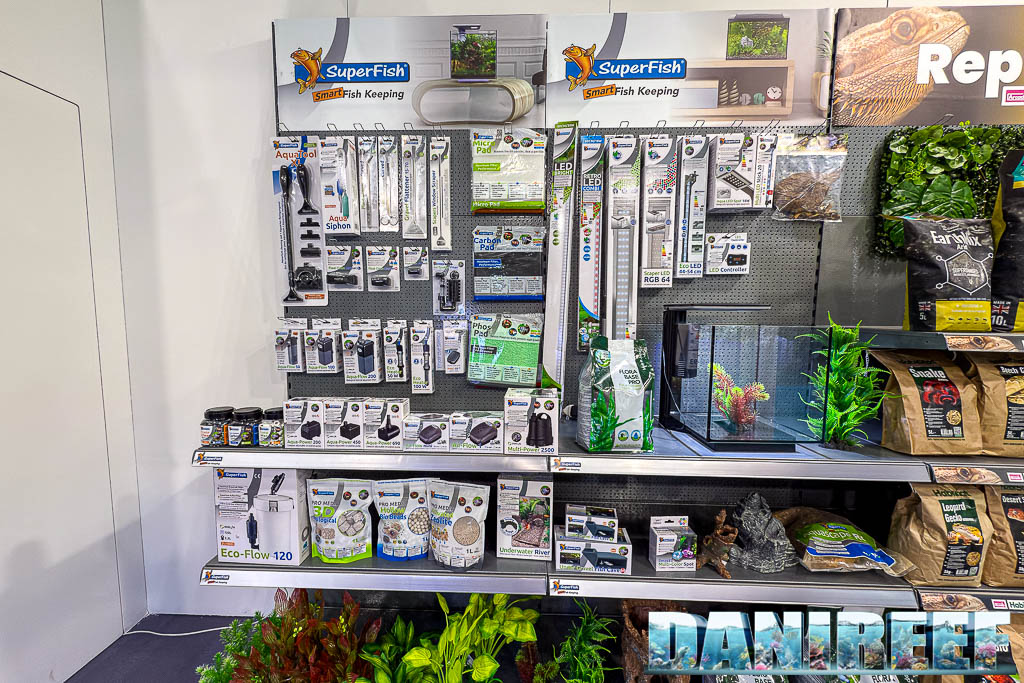 Il brand di riferimento in questo caso è SuperFish, e possiamo vedere nella parete attrezzata tanti piccoli ed interessanti oggetti. Dalle lampade, ai prodotti per pulire il fondo, a piccole pompe, fino ad arrivare ai piccoli acquari sui quali torneremo a breve. Ma quello che emerge subito è il fatto che abbiano un catalogo estremamente vasto, dove si possa trovare davvero di tutto.