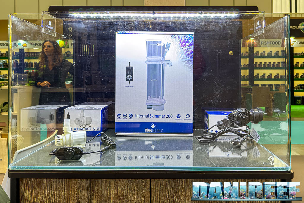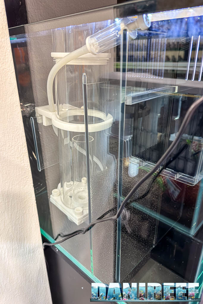Dotato di una lampada a LED da 52 watt, con 49 LED da 8-1000°K e 49 LED blue compresi nella lunghezza d’onda di 460 e 465 nm. Il filtro è posteriore, con pompa di risalita da 1000 l/h e lo schiumatoio appeso che vedete nella foto seguente: