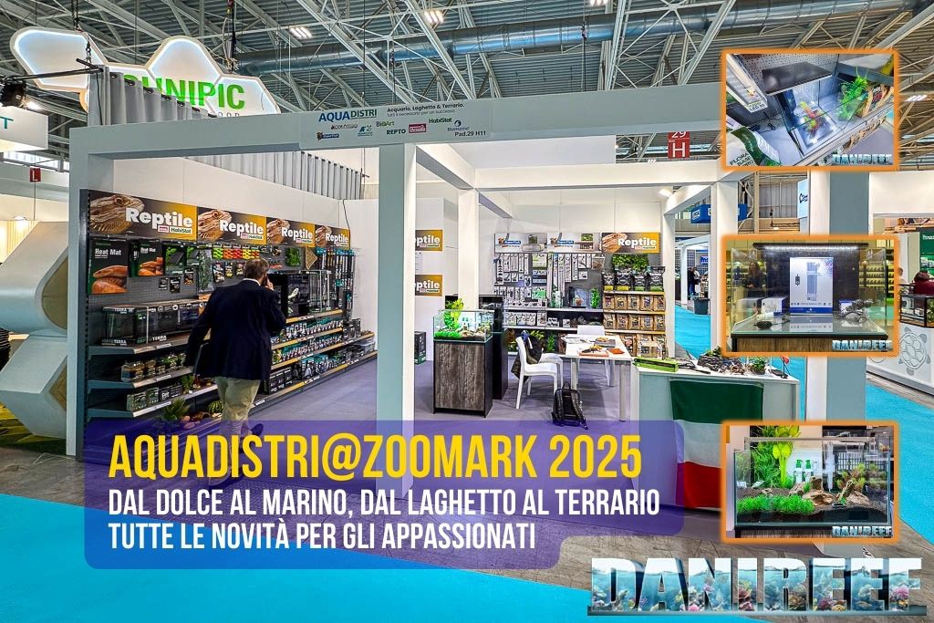 Il primo contatto con AquaDistri avviene presso il proprio stand durante Zoomark 2025. Lo stand era diviso praticamente a metà, da una parte tutto quanto relativo ai rettili e dall’altra invece tutto quanto relativo all’acquariofilia, cosa di cui noi, ovviamente, ci occupiamo nello specifico.