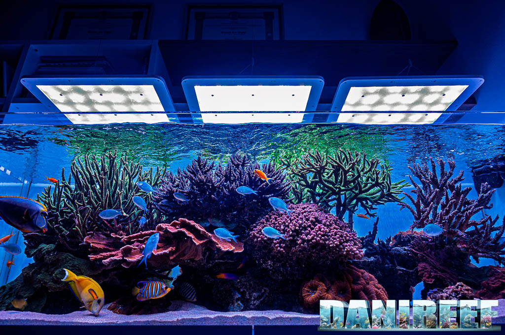 The first impression is spectacular: a lively, diverse community moving through the rockwork, with vivid colors and contrasts that shift with the lighting. Surgeonfish rule the scene with elegance, accompanied by small schooling species that add motion and a natural feel. Corals—mostly SPS—create vistas that closely recall a natural reef.