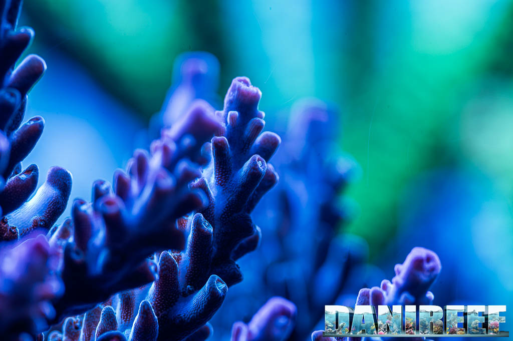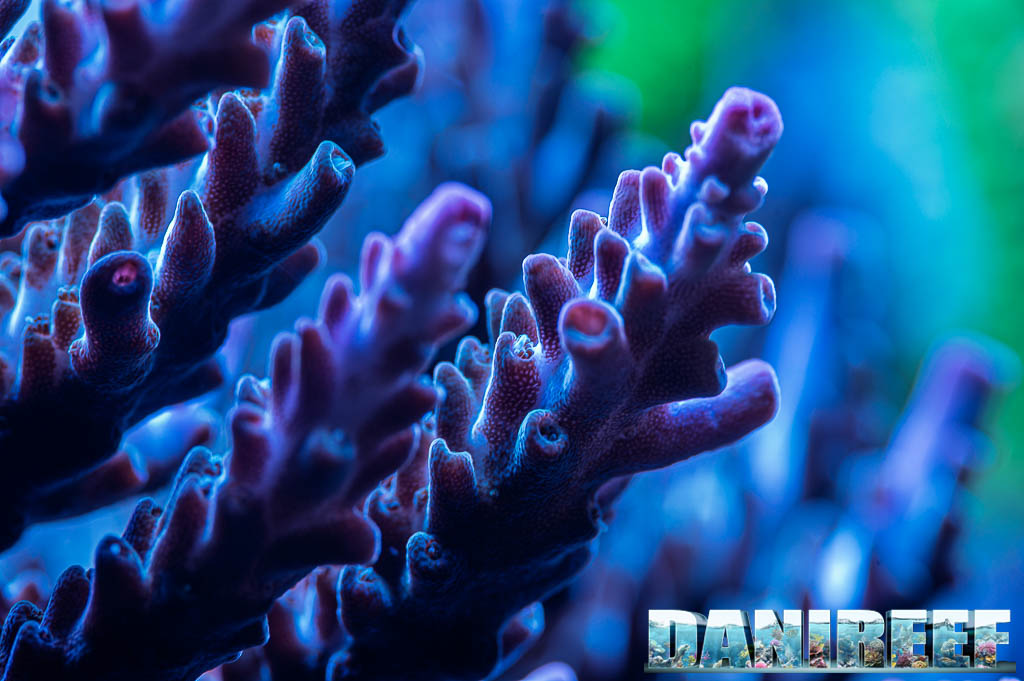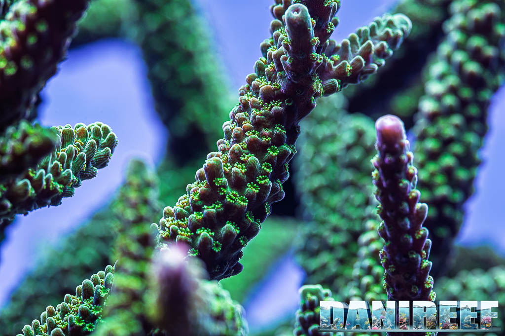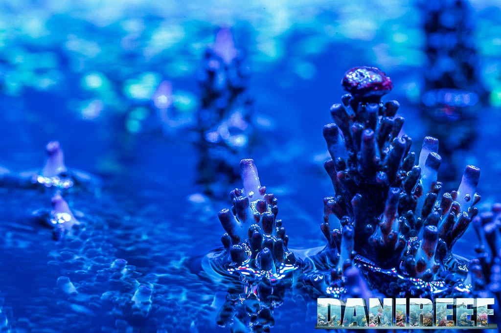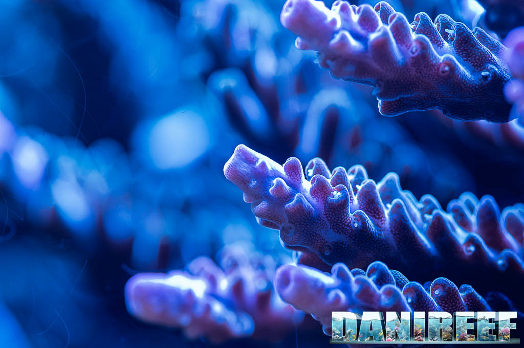 Top-down view: mature colonies and compact growth.Acropora close-up: extended polyps and healthy tissue.Among the branches: well-formed tabular growth.Foreground architecture of a branched SPS Acropora.Under blue light, the polyps show their fluorescence.Growth detail: active tips and compact tissue.Acropora nobilis profile: dense, even branching.Stylophora pistillata: compact texture with clearly visible polyps.In the foreground, the apical tips of Acropora nobilis.Top view: aquascape density and shadowing.Top view: colony placement and growth spaces.Overall scene: SPS-dominant and a balanced layout.