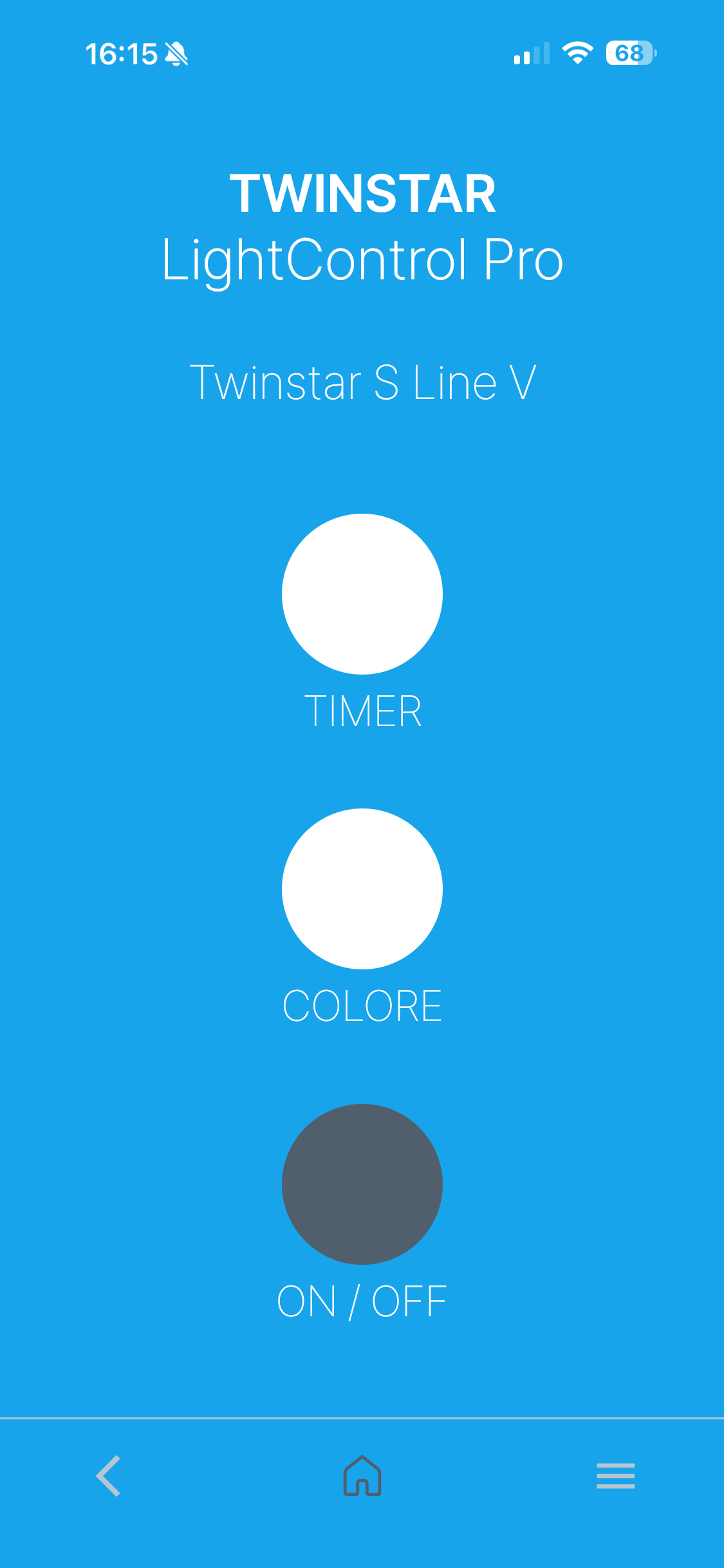 Il controller permette di controllare ogni aspetto della plafoniera tramite una app che si collega tramite Bluetooth alla plafoniera. Una applicazione potentissima, velocissima che stupisce per immediatezza e facilità d’uso. Basta vedere la prima schermata che ci lascia davanti a soli tre pulsanti. Uno per l’accensione e lo spegnimento diretto, uno per la regolazione del colore ed uno per l’impostazione del timer. Nessun fronzolo. Semplice e diretta.