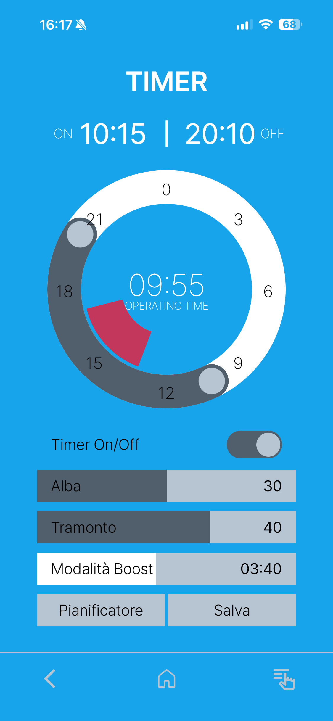 Dalla schermata timer si può impostare la durata complessiva della luce, la durata di alba e tramonto, differenziate tra loro, e si può entrare nel pianificatore. Una funzione che permette di variare la potenza per 25 giorni, permettendo un adattamento del proprio acquario a questa potente plafoniera, per evitare di bruciare le piante. Tutto così, semplice, intuitivo e velocissimo.