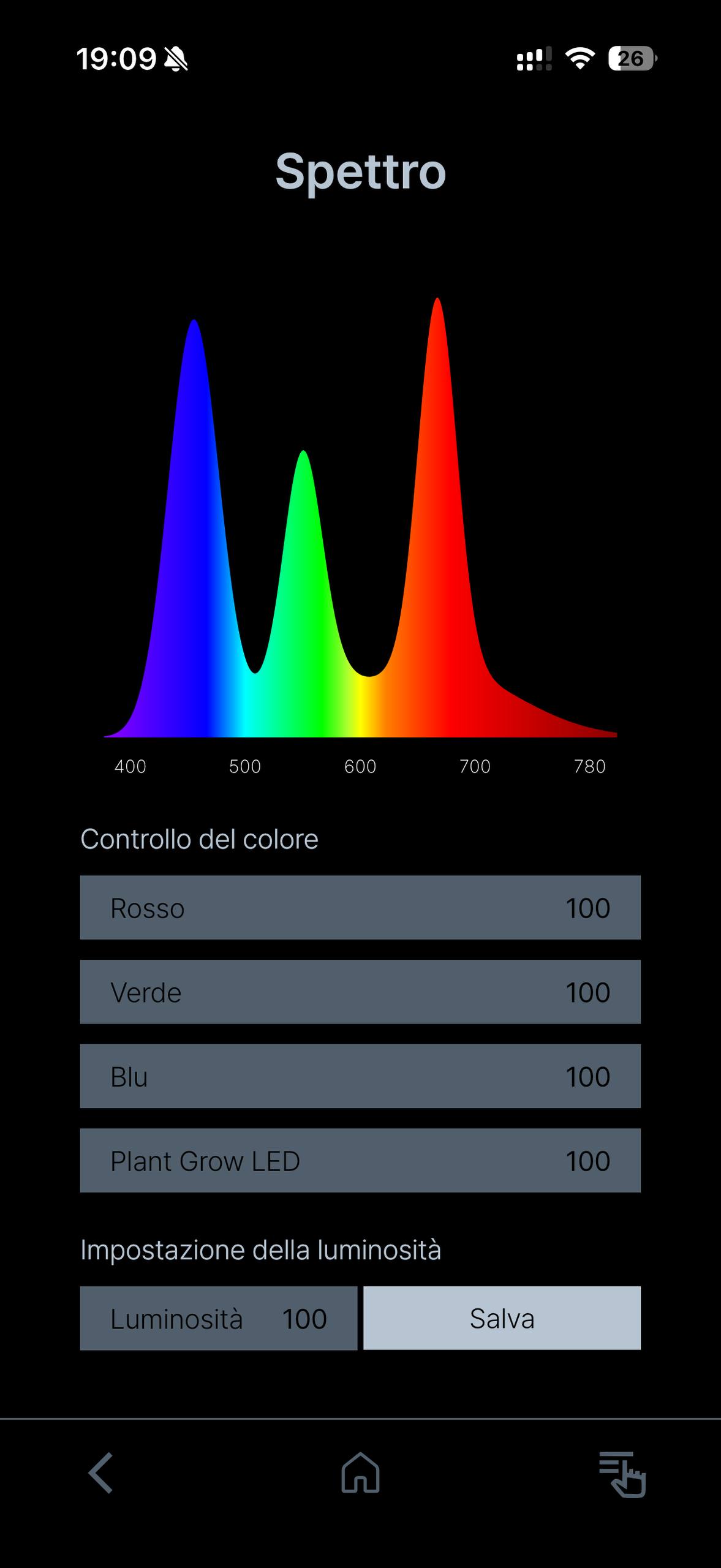 Dalla schermata del colore, quella con lo sfondo nero per capirci, è possibile agire sulle tre colorazioni principali, blu, verde e rosso, e su quella che in Twinstar chiamano Plant Grow LED. Mentre si agisce sui potenziometri si vede variare lo spettro in maniera dinamica. Ovviamente è possibile anche impostare la potenza massima della plafoniera.