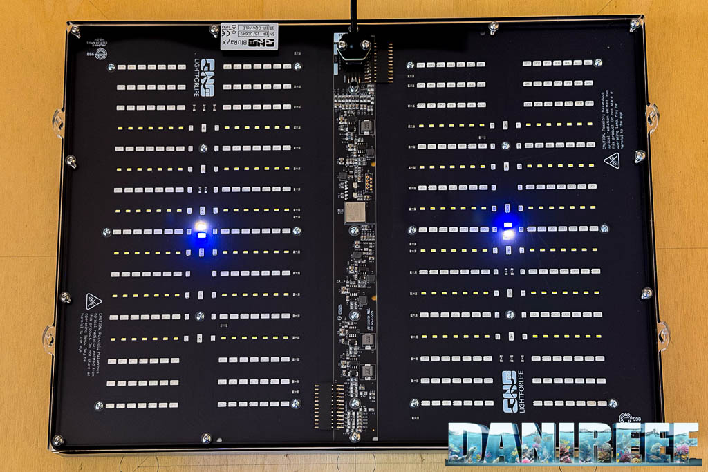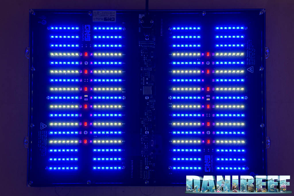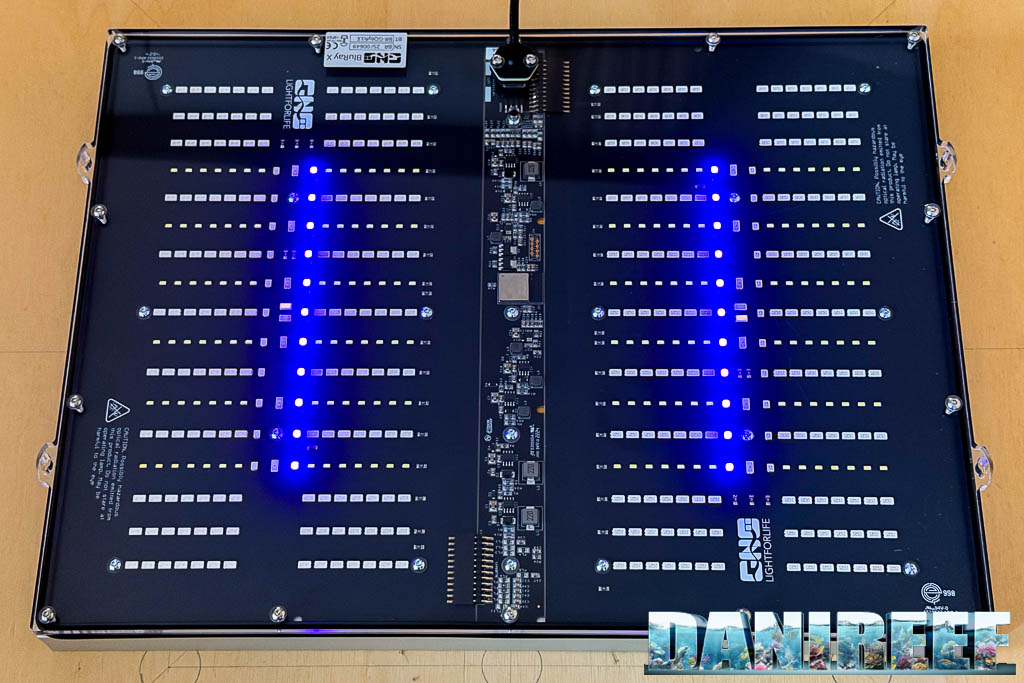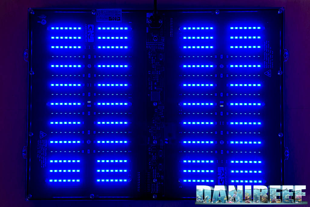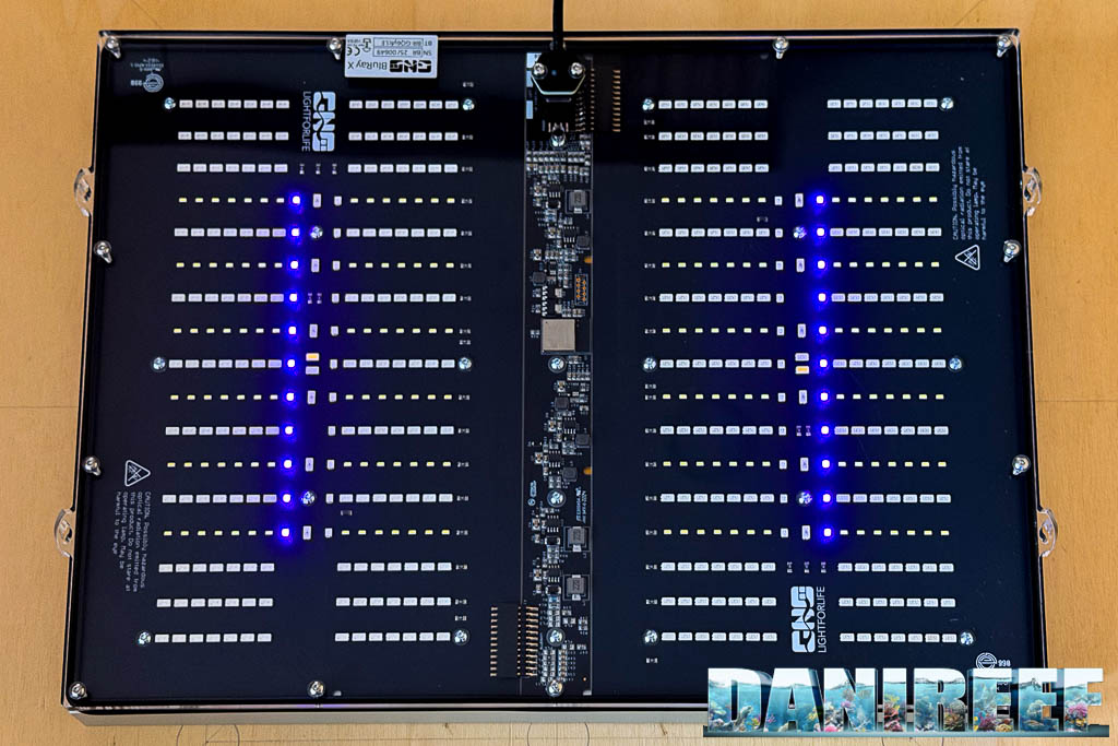 Uno dei punti di forza della GNC BluRay X è senza dubbio il numero dei LED contenuti nella plafoniera, ben 536! Vi sfido a trovare nel mercato qualcuno che faccia qualcosa di simile. Il marchio di fabbrica di GNC sin dalla sua prima plafoniera che abbiamo testato ben 12 anni fa (GNC 466). Partendo dallo studio dei coralli, anche grazie a progetti internazionali, GNC si è concentrata anche sull’estremo dello spettro, quei LED UV che in pochi si spingono a montare sulle plafoniere.