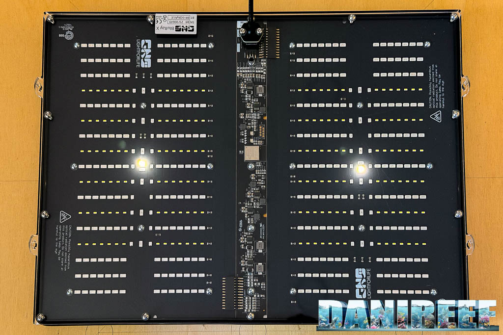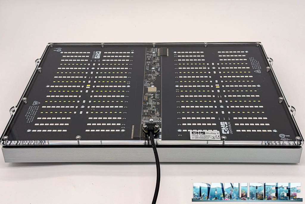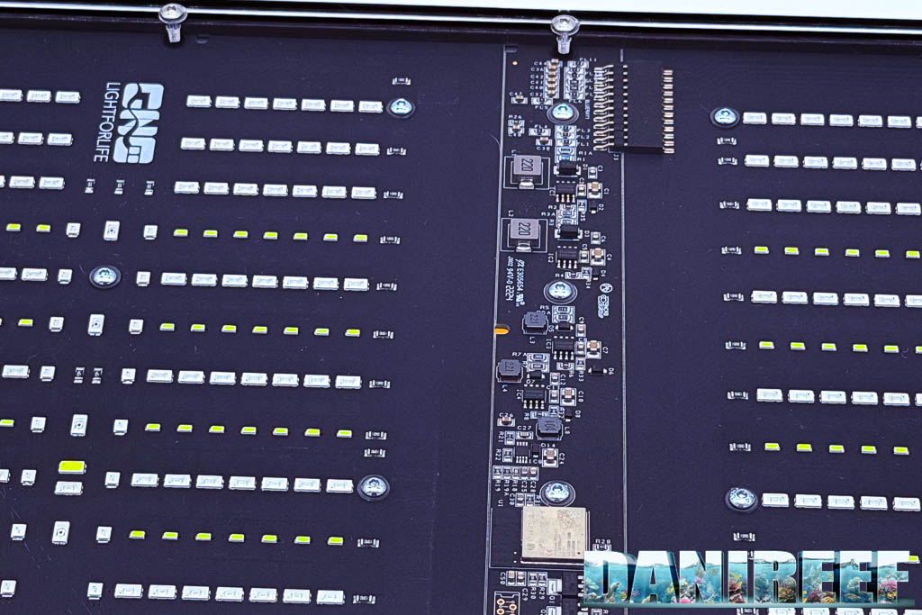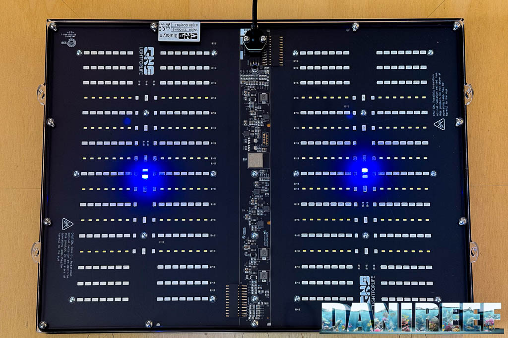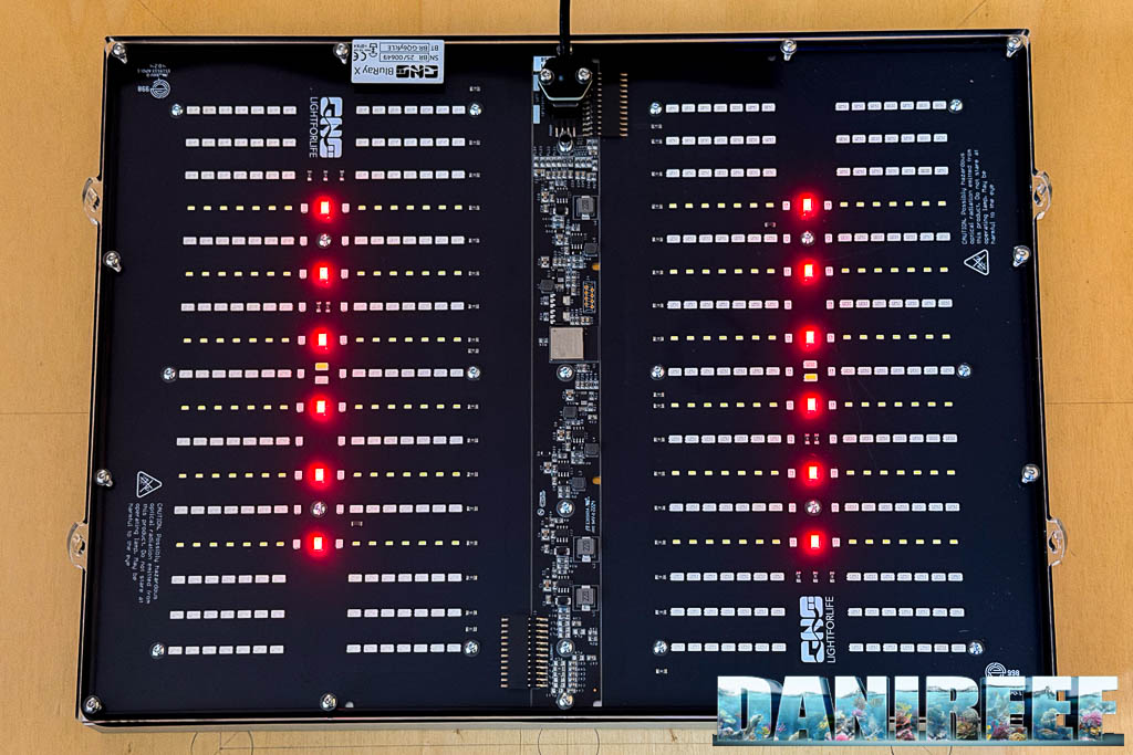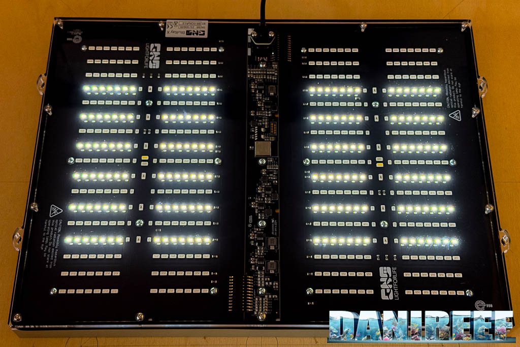 Uno dei punti di forza della GNC BluRay X è senza dubbio il numero dei LED contenuti nella plafoniera, ben 536! Vi sfido a trovare nel mercato qualcuno che faccia qualcosa di simile. Il marchio di fabbrica di GNC sin dalla sua prima plafoniera che abbiamo testato ben 12 anni fa (GNC 466). Partendo dallo studio dei coralli, anche grazie a progetti internazionali, GNC si è concentrata anche sull’estremo dello spettro, quei LED UV che in pochi si spingono a montare sulle plafoniere.