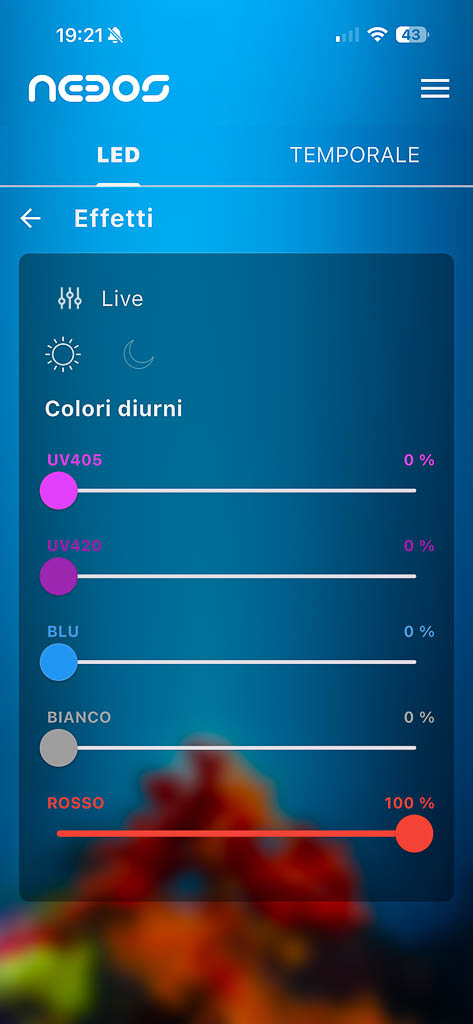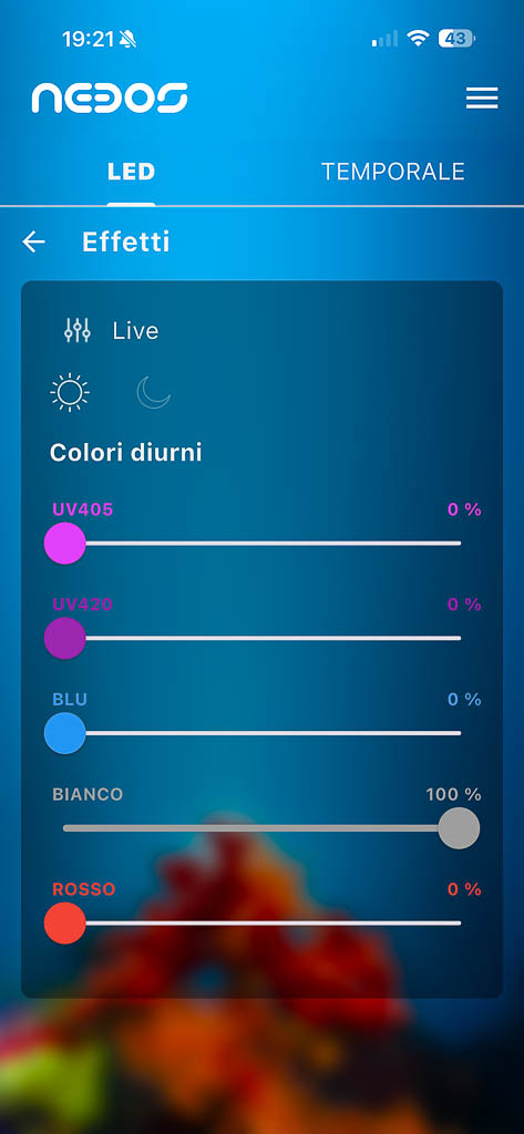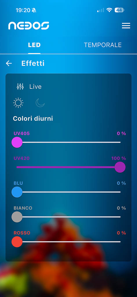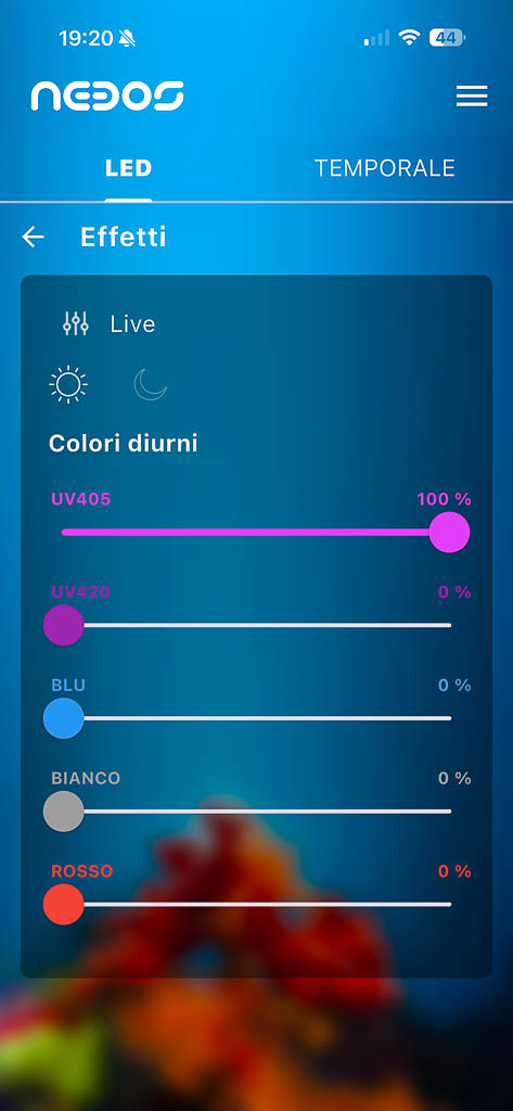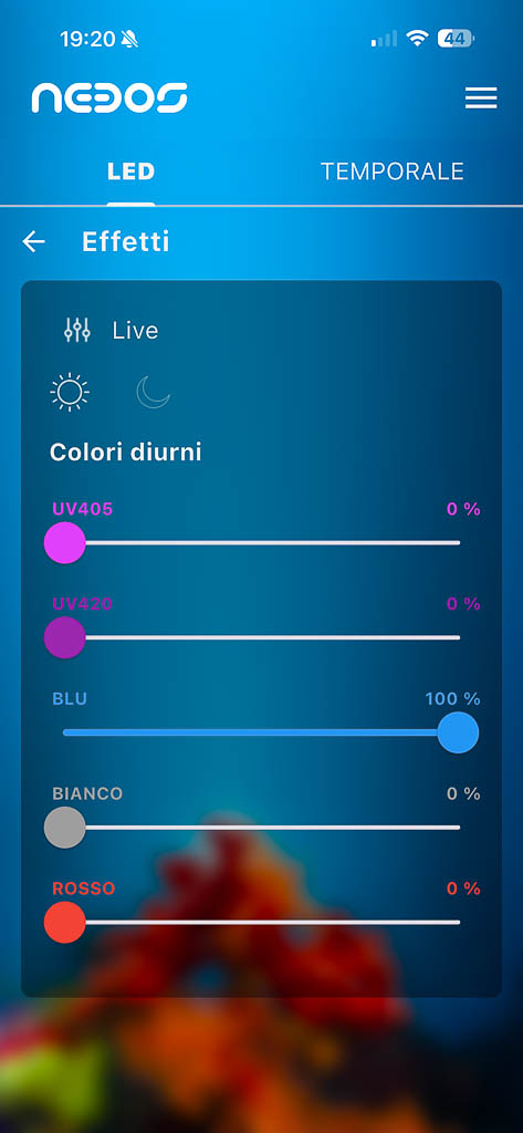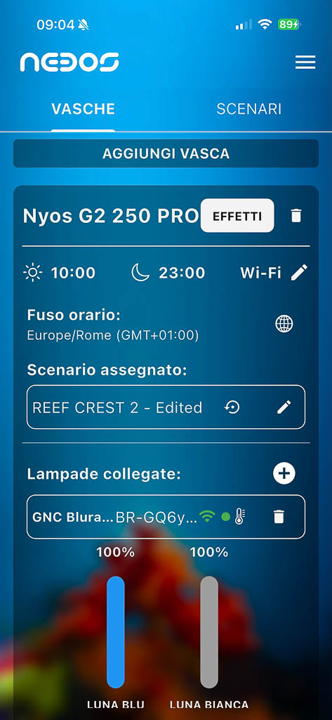 Qui sopra vedete la schermata principale espansa, dove potete vedere il vostro acquario, lo scenario utilizzato, le lampade che ne fanno parte, il collegamento wifi attivo ed il segnale che la temperatura è sotto controllo. Inoltre vedete i led attivi nel momento in cui vi siete collegati. Quando ho fatto lo screenshot era ancora mattina, per cui si visualizzano solo i LED lunari.