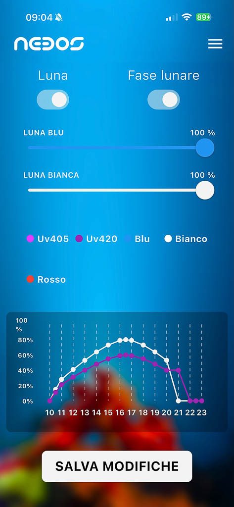 Io ho preferito, per ora, il Reef Crest 2, a cui ho aggiunto la luna e le fasi lunari, che non sono attive per default, e ho leggermente accorciato il fotoperiodo. Nel dettaglio seguente potete vedere anche l’immagine della variazione dei LED durante la giornata.