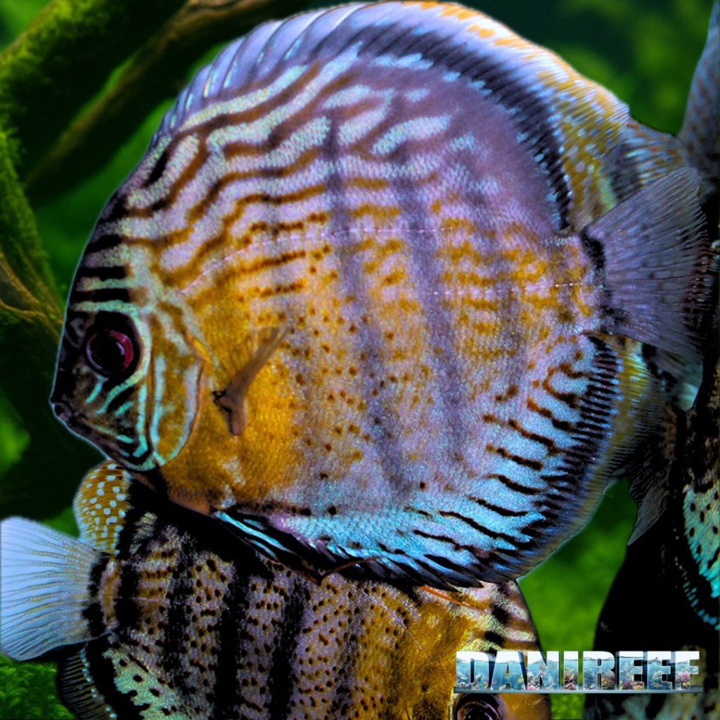 - Symphysodon aequifasciatus: il nostro Discus blu/verde, diffuso principalmente nel bacino amazzonico orientale. Vive in acque nere, bianche e chiare, mostrando colorazioni variabili dal blu al marrone con le tipiche bande verticali.