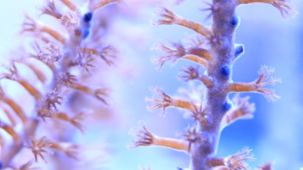 I rami sono ricoperti da tessuto vivente, punteggiato da piccoli polipi che ricordano piumini o fiori microscopici.