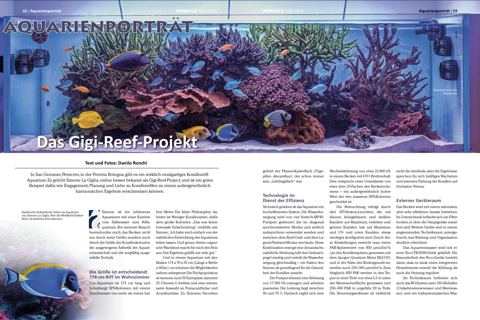 Il mio reportage fotografico e tecnico dedicato all’acquario di Simone La Giglia è pubblicato in questo numero con il titolo “Das Gigi-Reef-Projekt”. Si tratta di un vero e proprio ritratto d’acquario, in cui vengono raccontati impostazione, tecnica, filosofia gestionale, movimento, illuminazione, filtrazione, alimentazione e popolazione ittica di una vasca che colpisce sia per dimensioni sia per maturità biologica.
